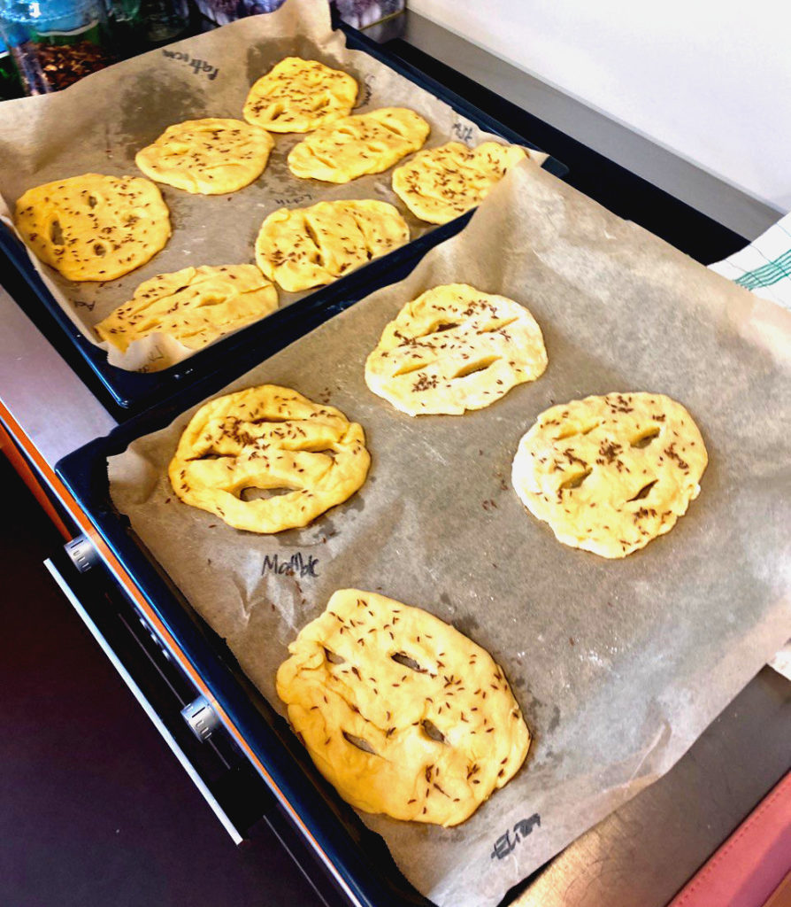 Alle Fastenwähen mit Eigelb bestreichen und dann können sie mit dem ausgewählten Topping bestreut werden (viele Kinder mögen Kümmel nicht, also Vorsicht!)