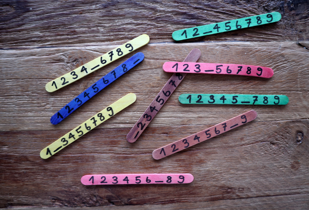 Ich habe farbige Stäbchen gewählt, damit das Spiel etwas farbiger und interessanter scheint. Dann habe ich bei den Zahlen 1 bis und mit 10 immer auf einem Stäbchen eine Zahl mit dem Strich ersetzt. Die Zahlen können den 10er, 20er oder auch 100er Raum umfassen. Für die Kindergartenstufe eignet sich der Zahlenraum bis und mit 10 jedoch prima. Danach muss man die Holzklammern mit den fehlenden Zahlen beschriften: