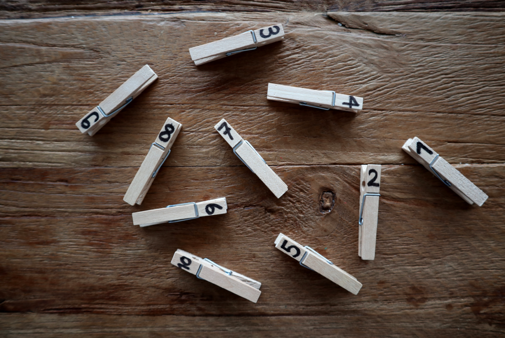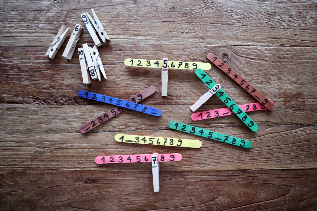 Die Kinder können dann die Holzklammern den richtigen Stäbchen zuordnen und üben sich dabei im Erkennen von Zahlen.