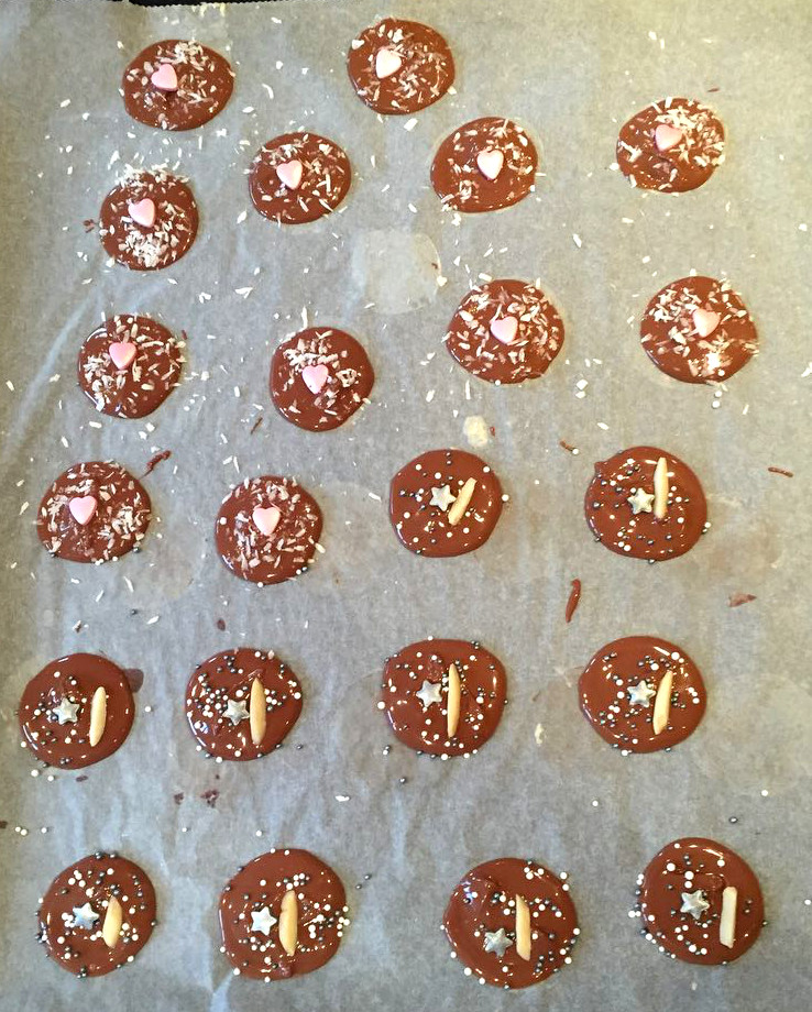 Ihr könnt dafür irgendeine Schokolade nehmen, die ihr gerne habt. Wir haben es mit Milchschokolade, dunkler und weisser Schokolade ausprobiert. Ihr müsst die Schokolade dafür nur in einem kleinen Topf zum Schmelzen bringen und anschliessend mit dem Löffel kleine Portionen auf ein vorbereitetes Backblech verteilen.
