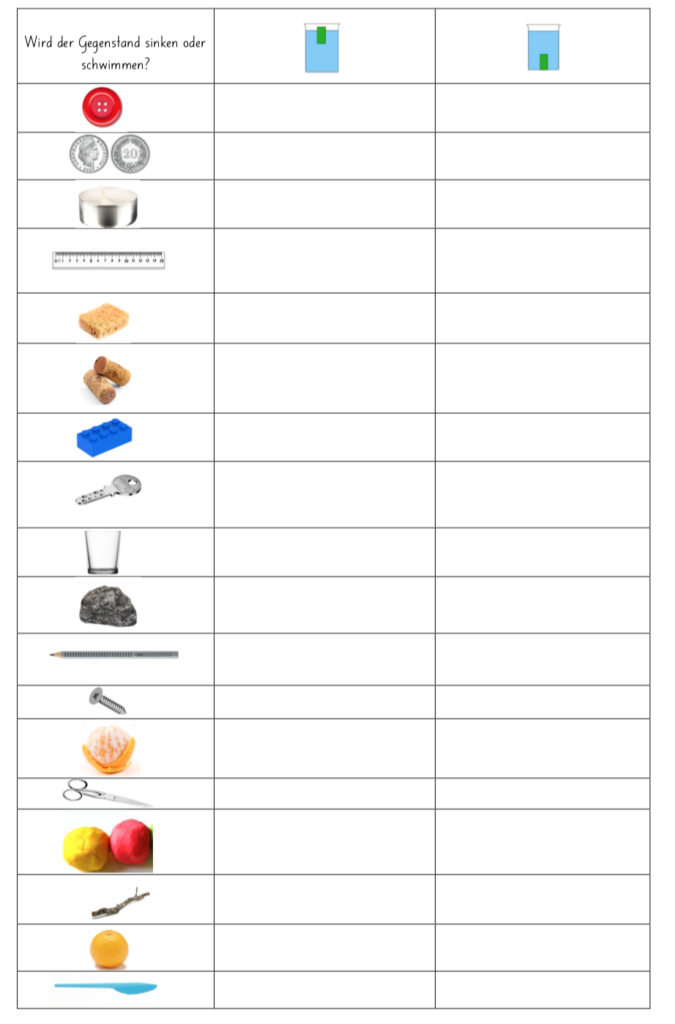 Wir haben im Sommer sehr viel um das Wasser herum experimentiert. Wichtig war mir dabei auch, dass die Schülerinnen und Schüler lernten, wie man Vermutungen zu etwas anstellt. Sie erhielten ohne grosse Einführung ein Blatt, auf welchem sie ihre Vermutung ankreuzen sollten: sinkt der Gegenstand oder schwimmt er im Wasser?