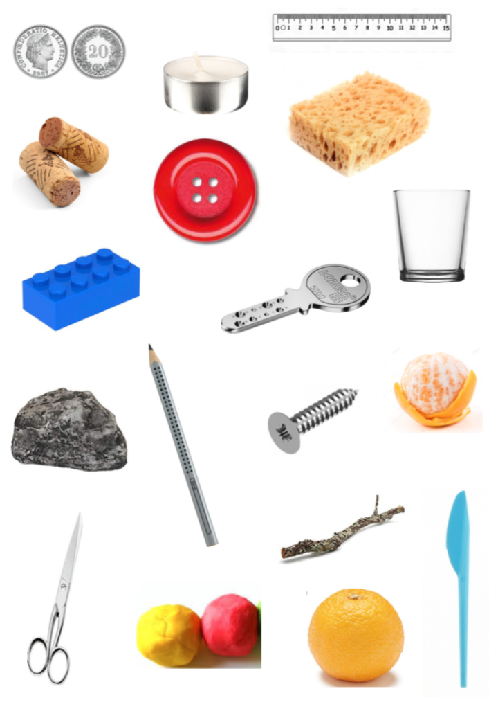 Anschliessend durfte jedes Kind einer der Gegenstände auf dem Blatt in eine grosse Schüssel mit Wasser legen und alle konnten zuschauen, ob ihre Vermutung richtig oder falsch war. Nach diesem Klassenexperiment erhielten die Kinder die Aufgabe, diese Informationen festzuhalten. Dafür haben sie ein Blatt mit allen Gegenständen sowie ein Blatt mit einer Abbildung von Wasser erhalten.