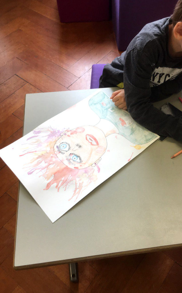 Ich wollte dieses Porträt jedoch etwas lustiger als sonst gestalten. Dafür habe ich allen Kindern ein A3 Blatt gegeben (unbedingt dickeres Zeichnungspapier verwenden!) und fünf verschiedene Wasserfarben bereits mit Wasser in einer kleinen Schale verdünnt. Jedes Kind erhielt von mir ein Röhrchen und durfte dann eine ausgewählte Farbe nehmen und die Haare lustig gestalten, indem es einen Wassertropfen mit dem Röhrchen verfolgte und so lustige Haarsträhnen kreierte. Die Haare mussten zuerst trocknen, dann konnten die Kinder mit dem Gesicht anfangen. Dies haben wir mit Farbstiften gemacht, damit auch die Details erkannt werden konnten.